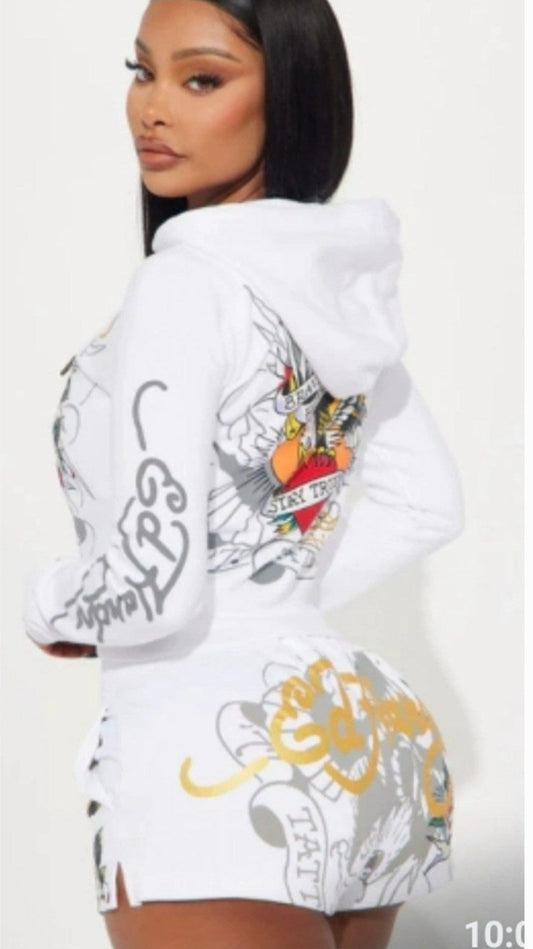 Chill Set- Graphic Print long sleeve hoodie 2 pc Short Set